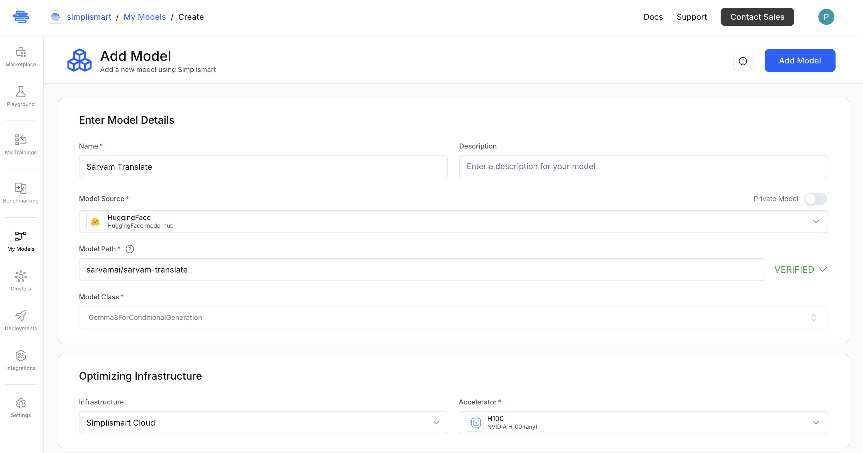 - Enter the model path: sarvamai/sarvam-translate and click on Verify. It will auto-populate the model optimization details based on the model path.