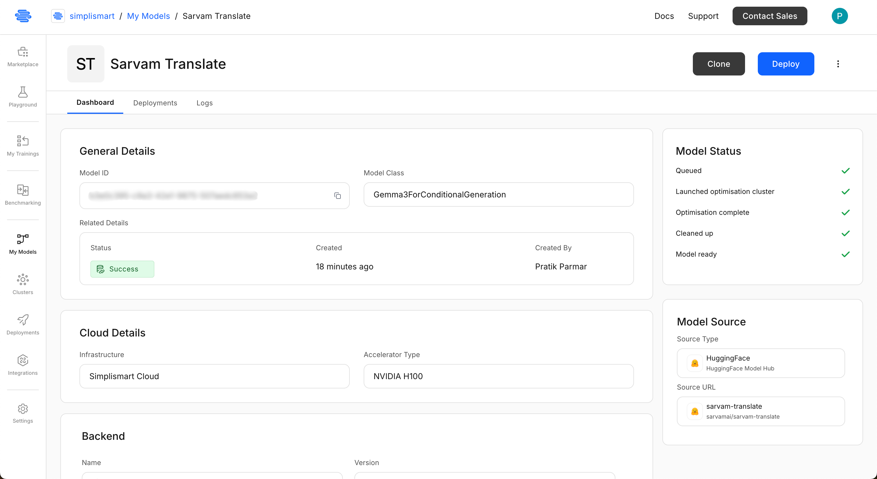 Simplismart is an end to end MLOps platform for optimizing, deploying, serving, and finetuning AI models with GPU-backed inference, auto-scaling, and observability built in. Here's how to get an Indic AI model like Sarvam Translate running in production in minutes.