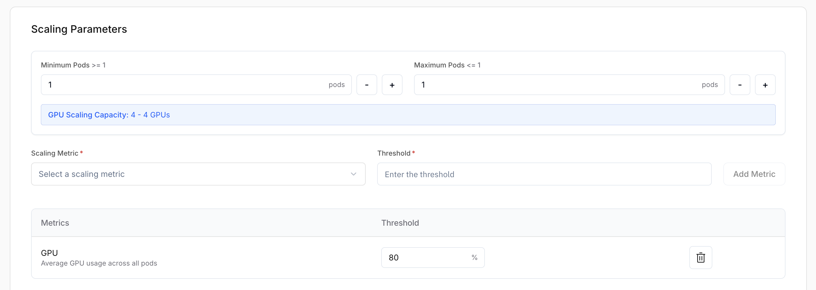 Also, select on which basis you want to scale the deployment. You can scale on CPU, GPU utilization, Time to First Token, Latency, Throughput, etc. Here we will scale on GPU utilization at 80%.
