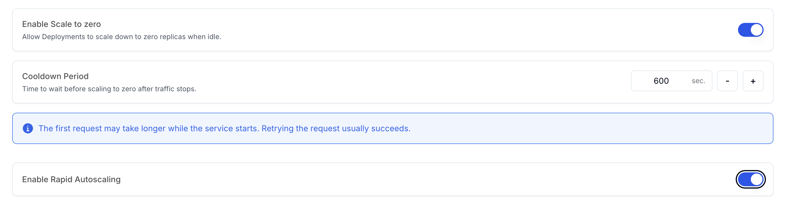 For production deployments, you can also configure Rapid Autoscaling to scale up your deployment quickly if there is a sudden surge in traffic.